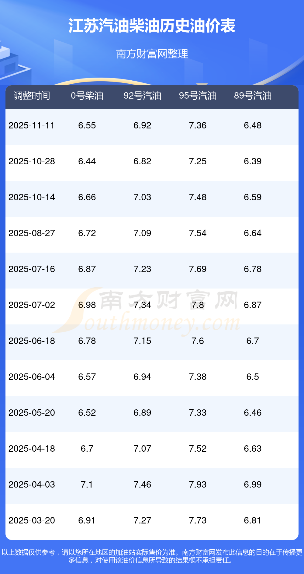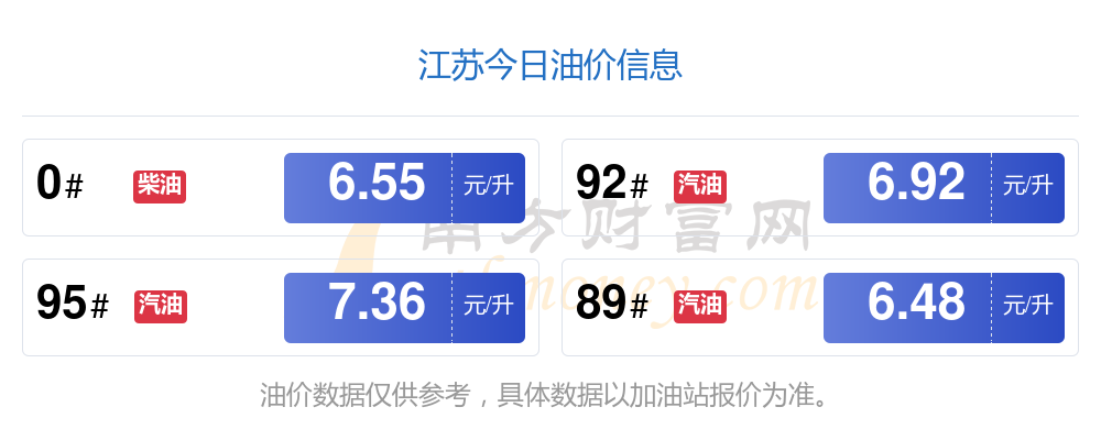 11月14日江蘇汽油、柴油每升最新價格多少錢一升?具體為:92號汽油6.92元,增了0.1元;95號汽油7.36元,增了0.11元;89號汽油6.48元,增了0.09;0號柴油為6.55元,增了0.11元,本次的調(diào)整時間是11月11日。