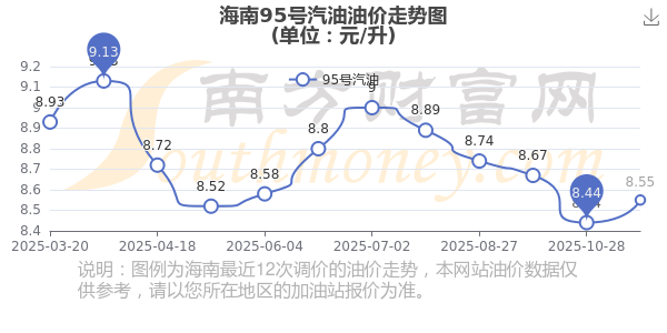 11月14日,海南95號汽油的價格是8.55元每升,本次的調(diào)整時間為11月11日,對比上次的調(diào)整增了0.11元,增1.303%,下次調(diào)整時間為11月24日24時,還有10.77天。