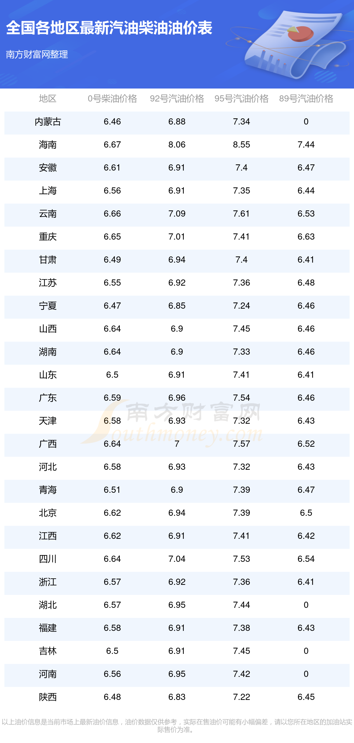 全國(guó)0號(hào)柴油平均價(jià)格為:7元每升,其中,最低為內(nèi)蒙古,價(jià)格6.46元/升,最高為海南,價(jià)格6.67元/升。