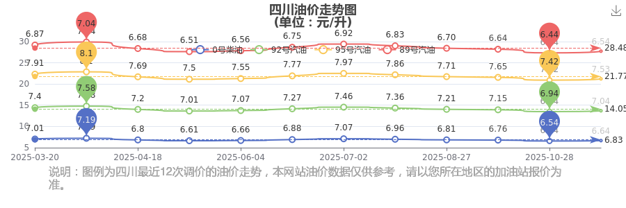11月14日四川汽油、柴油最新價(jià)格:本次油價(jià)調(diào)整時(shí)間是11月11日,92號(hào)汽油7.04元,增了0.1元,增幅達(dá)1.44%;95號(hào)汽油7.53元,增了0.11元,增幅達(dá)1.48%;89號(hào)汽油6.54元,增了0.1元,增幅達(dá)1.55%;0號(hào)柴油6.64元,增了0.1元,增幅達(dá)1.53%。