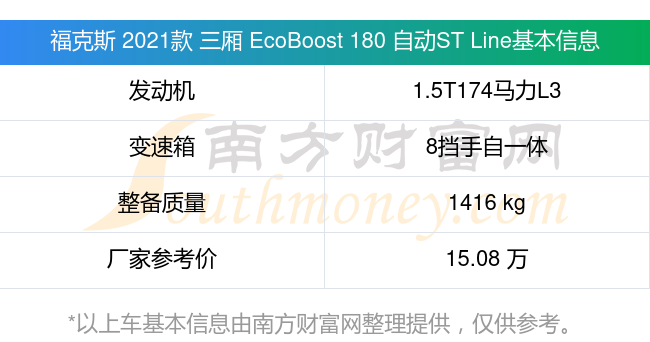 ?怂 2021款 三廂 EcoBoost 180 自動ST Line搭載了一臺1.5T174馬力L3渦輪增壓發(fā)動機,采用8擋手自一體自動檔變速箱,常規(guī)整備質(zhì)量1416kg,廠家參考價15.08萬元。