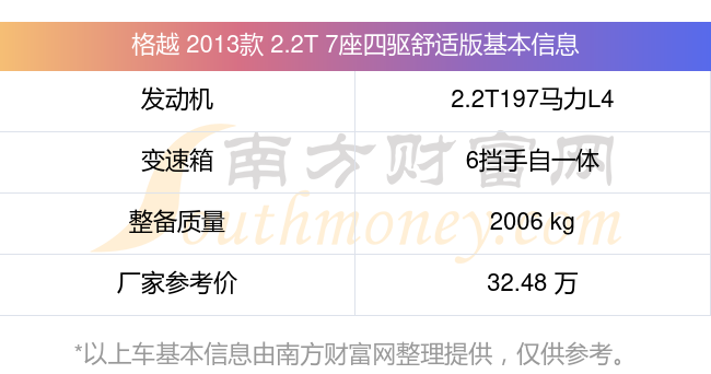 格越 2013款 2.2T 7座四驅(qū)舒適版動力上搭載的是一臺2.2T197馬力L4渦輪增壓發(fā)動機,匹配6擋手自一體自動檔變速箱,燃料形式為柴油,常規(guī)整備質(zhì)量2006kg,廠家參考價32.48萬元。