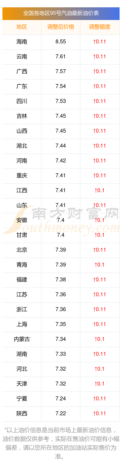 以上數(shù)據(jù)僅供參考,請以您所在地區(qū)的加油站實際售價為準。南方財富網(wǎng)發(fā)布此信息的目的在于傳播更多信息,對使用該油價信息所導(dǎo)致的結(jié)果概不承擔(dān)責(zé)任。