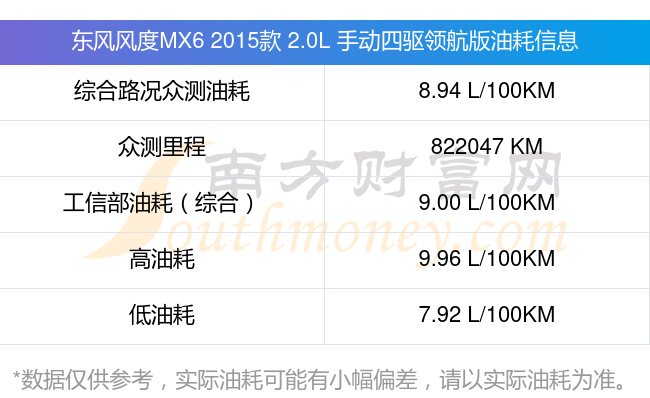 根據(jù)車主實測數(shù)據(jù),該車型低油耗為7.92L/100km,高油耗為9.96L/100km,綜合路況眾測油耗為8.94L/100km,工信部綜合油耗為9.00L/100km。