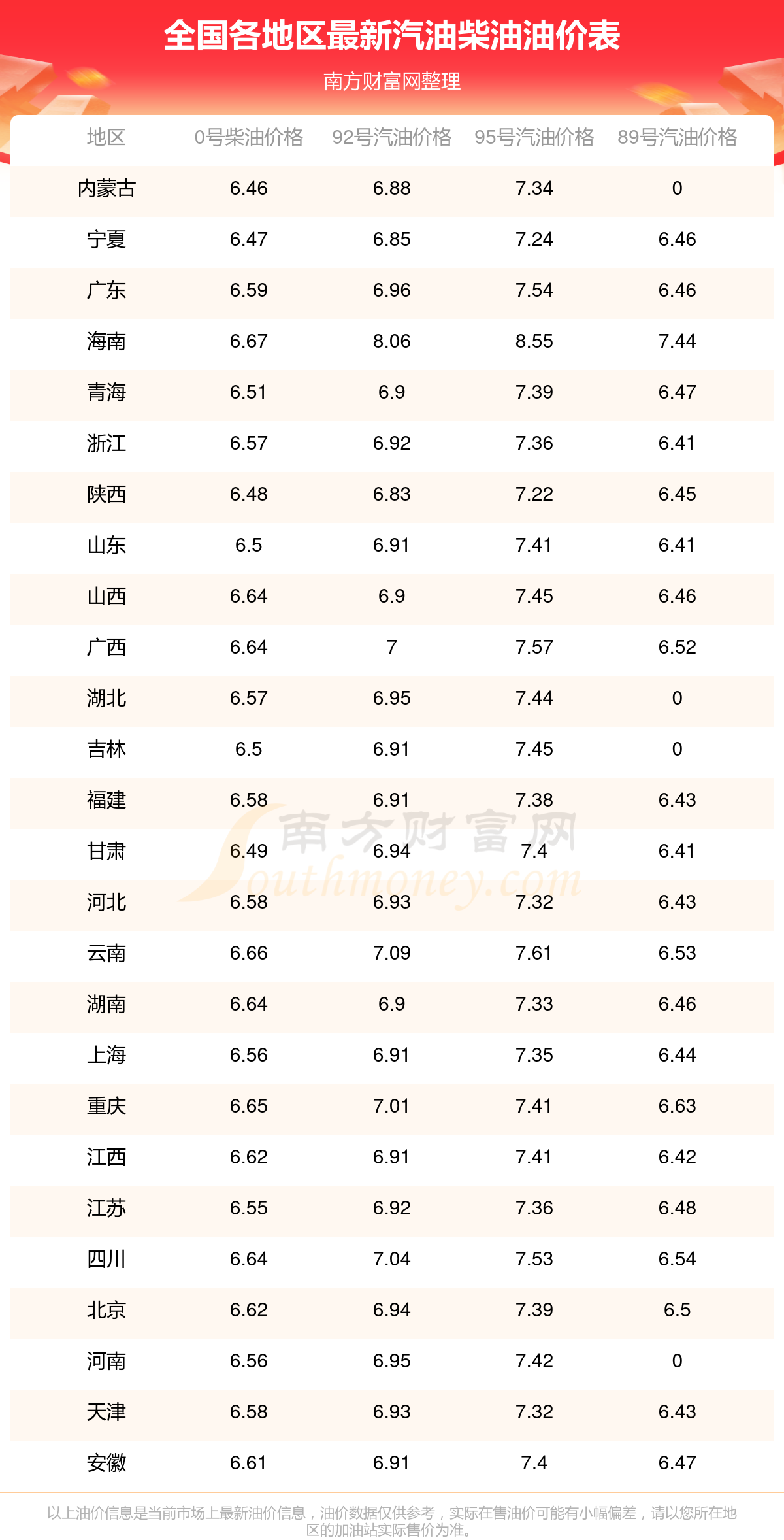 0號(hào)柴油平均價(jià)格:7元每升,其中,最高為海南,價(jià)格為6.67元/升,最低為內(nèi)蒙古,價(jià)格為6.46元/升。