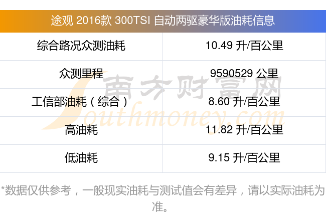 根據(jù)多位車主實(shí)測(cè)得出數(shù)據(jù),該車型低油耗為9.15升每百公里,高油耗為11.82升每百公里,綜合路況眾測(cè)油耗為10.49升每百公里,工信部綜合油耗為8.60升每百公里。