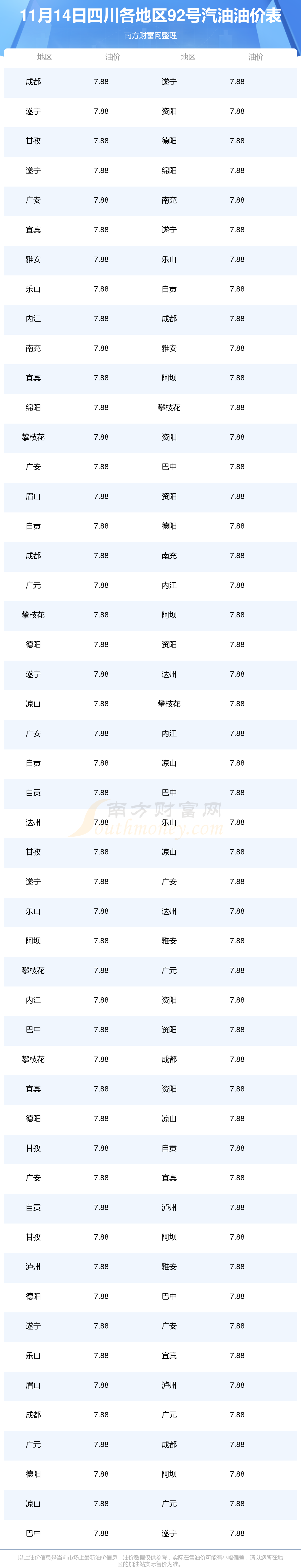四川92號汽油11月14日價格為7.04元每升,本次油價調(diào)整時間是11月11日,相對上次調(diào)整后10月28日的油價是6.94元/升,上漲了0.1元,上漲幅為1.441%。
