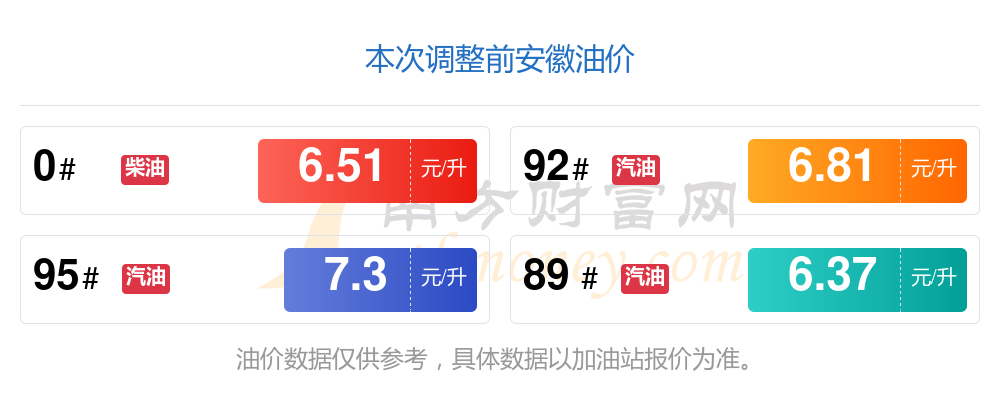 11月14日安徽汽油、柴油每升最新價(jià)格多少錢一升?具體為:92號汽油6.91元,升了0.1元;95號汽油7.4元,升了0.1元;89號汽油6.47元,升了0.1;0號柴油為6.61元,升了0.1元,本次的調(diào)整時(shí)間是11月11日。