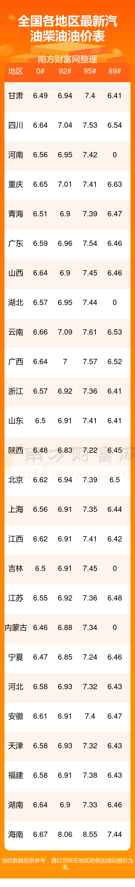 2025年11月14日全國各地汽油價(jià)格表一覽