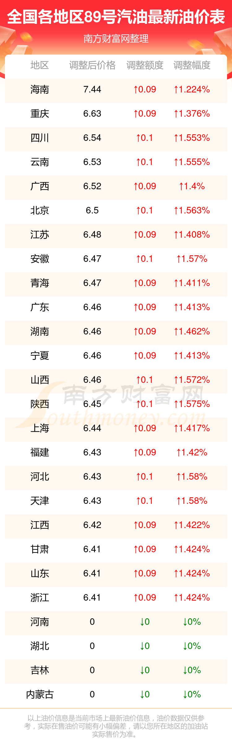 全國各地區(qū)89號(hào)汽油油價(jià)一覽表