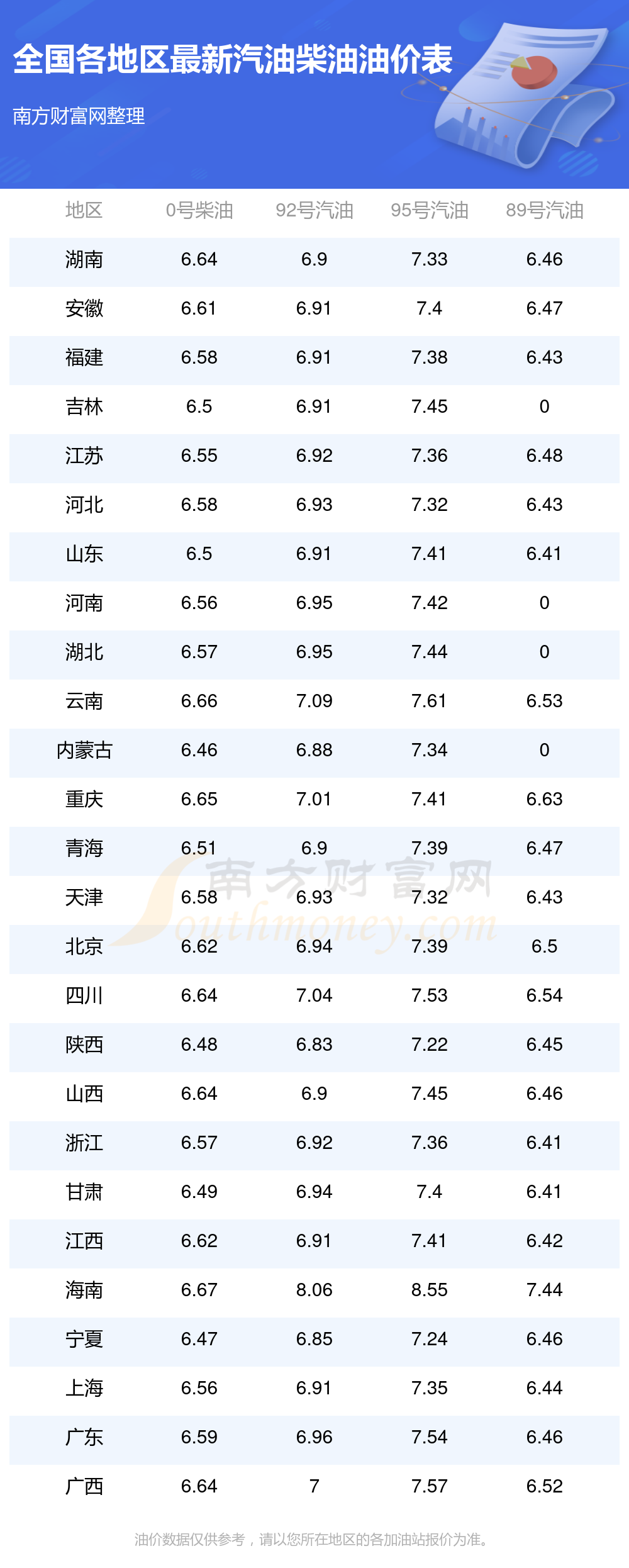 油價(jià)數(shù)據(jù)僅供參考,請(qǐng)以您所在地區(qū)的加油站報(bào)價(jià)為準(zhǔn)。南方財(cái)富網(wǎng)發(fā)布此信息的目的在于傳播更多信息,對(duì)使用該油價(jià)信息所導(dǎo)致的結(jié)果概不承擔(dān)任何責(zé)任。