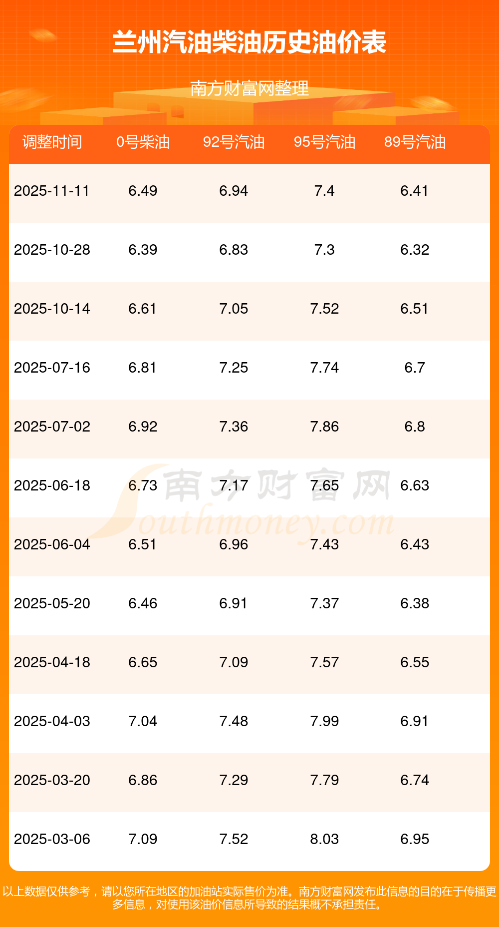 蘭州汽油柴油11月14日每升的價格為11月11日調整后的價格,各油價詳情如下:92號汽油6.94元;95號汽油7.4元;89號汽油6.41元;0號柴油6.49元。