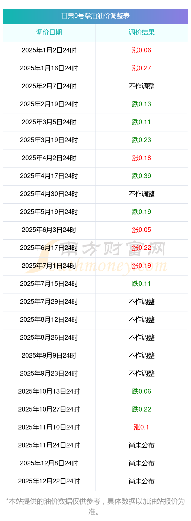 以上數(shù)據(jù)僅供參考,請以您所在地區(qū)的加油站實際售價為準。南方財富網(wǎng)發(fā)布此信息的目的在于傳播更多信息,對使用該油價信息所導致的結果概不承擔責任。