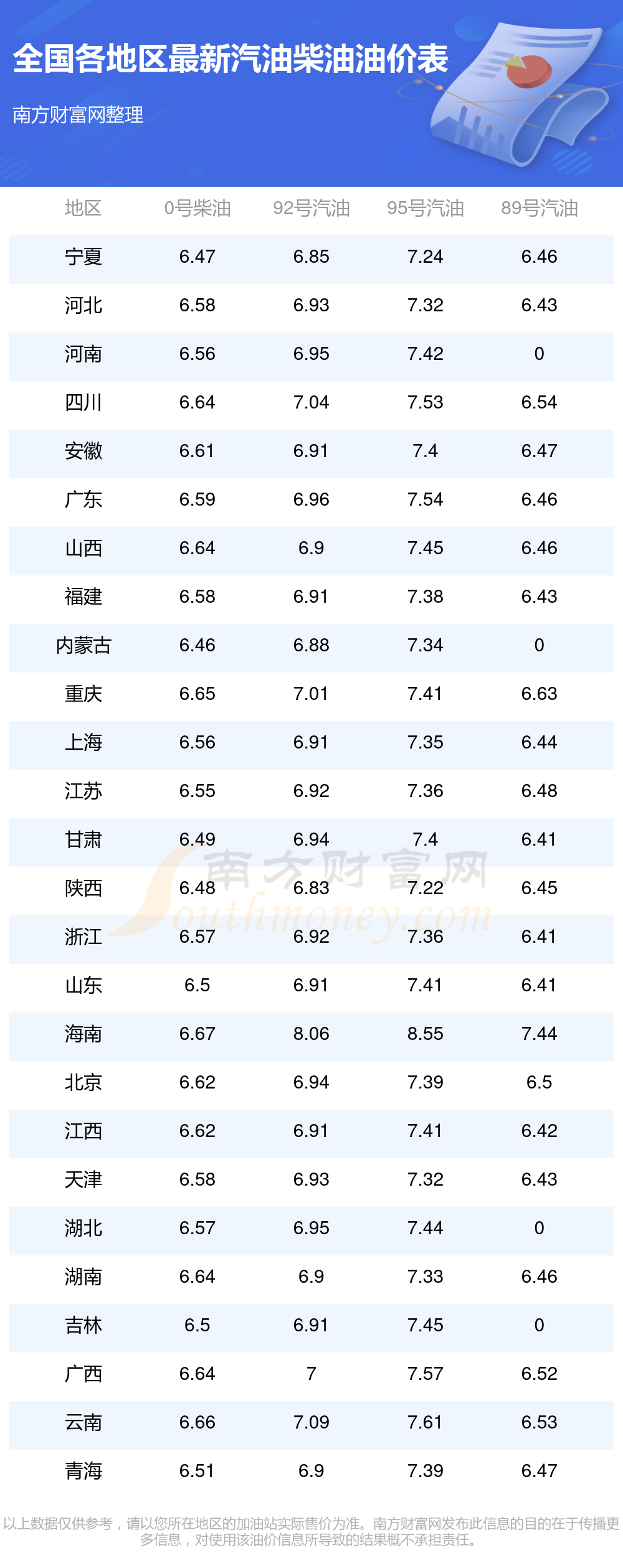 以上數(shù)據(jù)僅供參考,請以您所在地區(qū)的加油站實際售價為準(zhǔn)。南方財富網(wǎng)發(fā)布此信息的目的在于傳播更多信息,對使用該油價信息所導(dǎo)致的結(jié)果概不承擔(dān)責(zé)任。