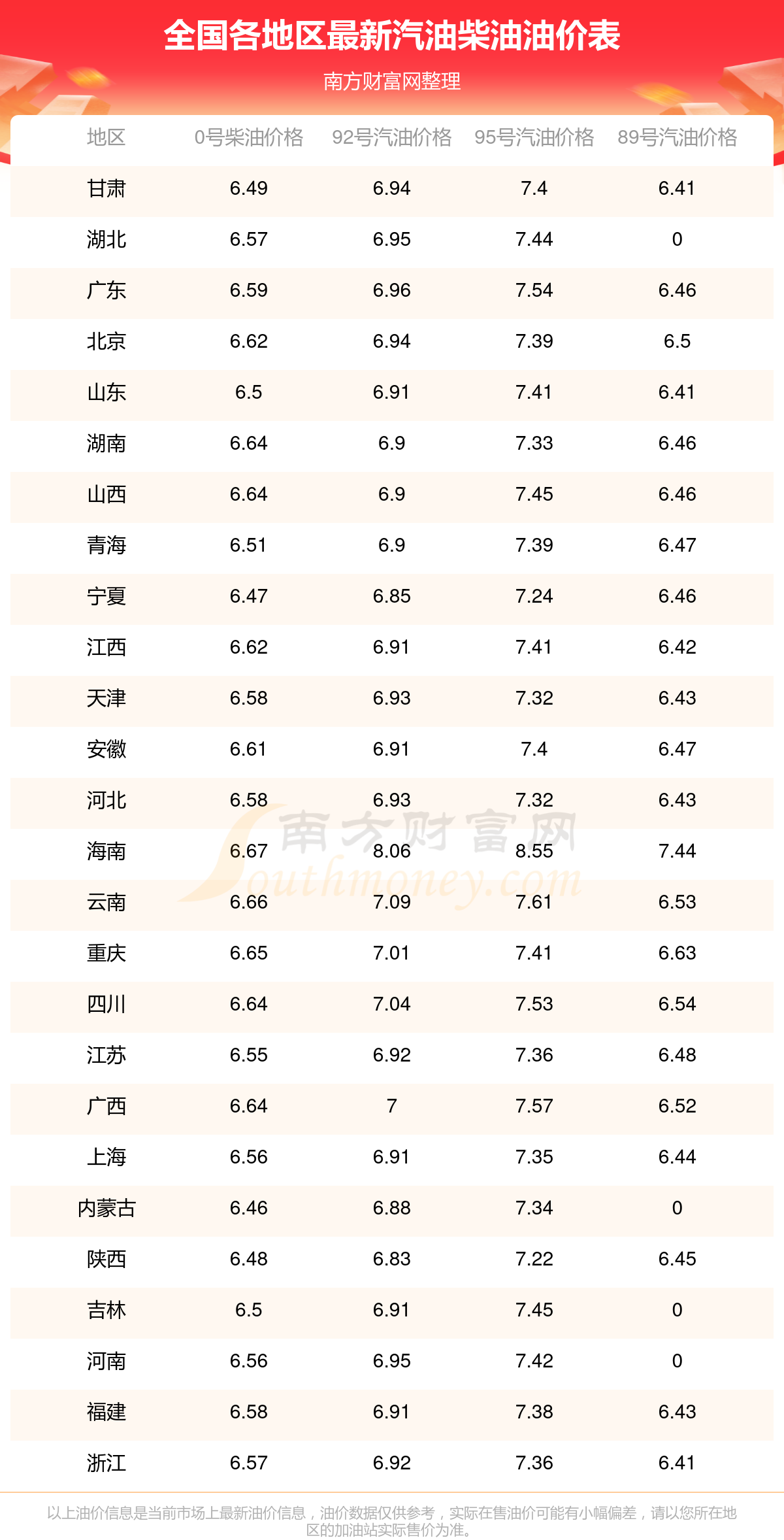 全國(guó)92號(hào)汽油最新平均價(jià)格為:7元每升,其中,最高為海南,價(jià)格為8.06元/升,最低為陜西,價(jià)格為6.83元/升。