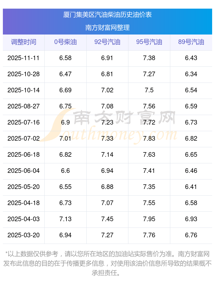 11月14日,廈門集美區(qū)汽油、柴油每升最新價(jià)格為:92號(hào)汽油為6.91元,漲了0.1元;95號(hào)汽油為7.38元,漲了0.11元;89號(hào)汽油為6.43元,漲了0.09元;0號(hào)柴油為6.58元,漲了0.11元,調(diào)整時(shí)間為11月11日。