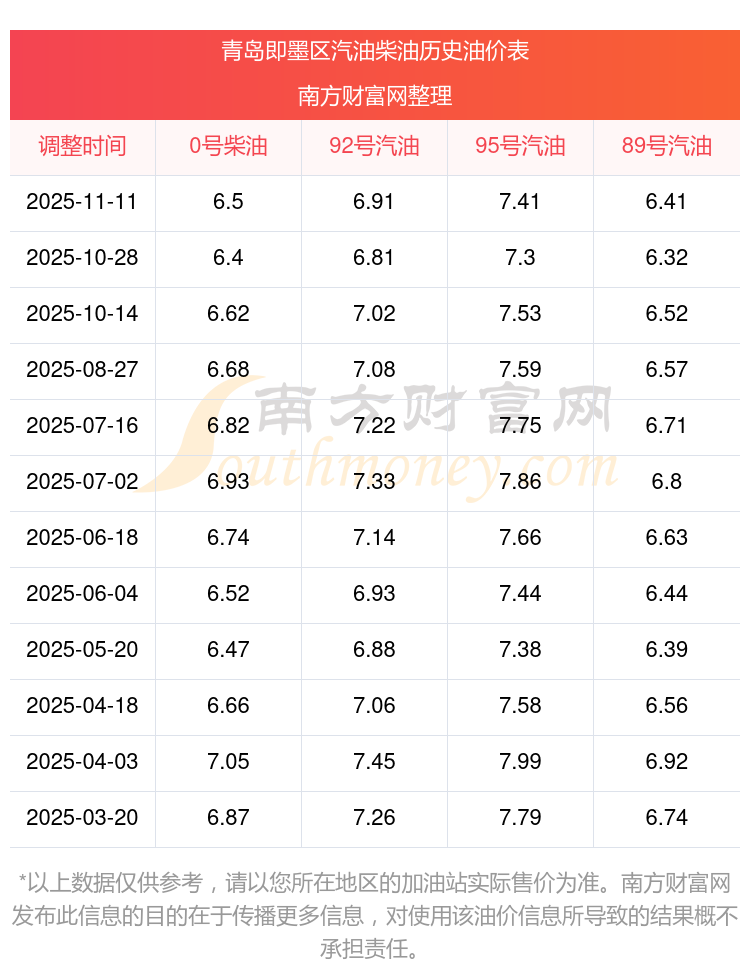 青島即墨區(qū)11月14日汽油價(jià)格詳情:92號汽油6.91元;95號汽油7.41元;89號汽油6.41元;0號柴油6.5元(該價(jià)格為11月11日調(diào)整后的價(jià)格)。