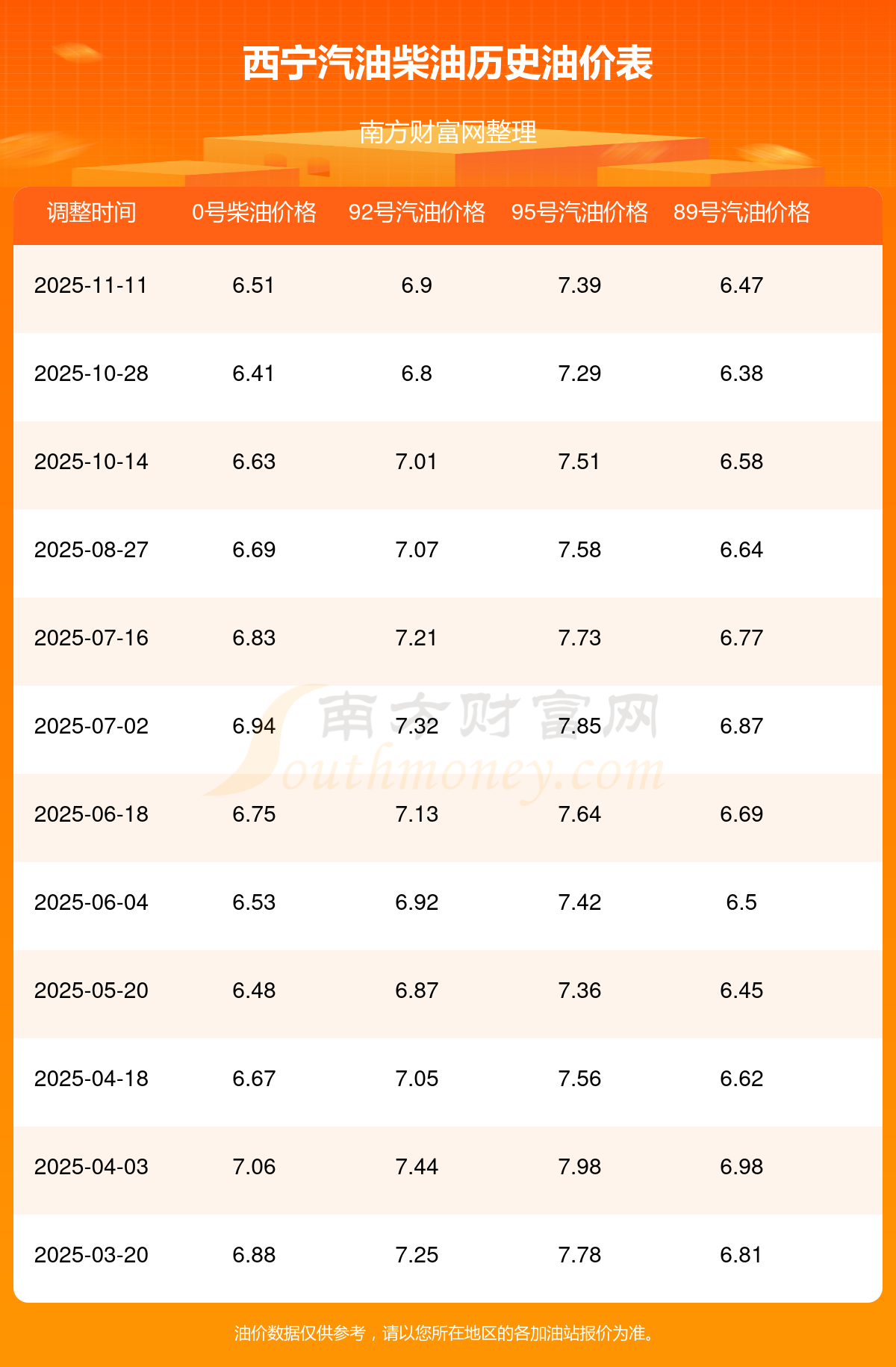 11月14日,西寧汽油、柴油每升的價(jià)格是多少?11月11日油價(jià)調(diào)整后,92號(hào)汽油為6.9元,增了0.1元,增幅達(dá)1.47%;95號(hào)汽油為7.39元,增了0.1元,增幅達(dá)1.37%;89號(hào)汽油為6.47元,增了0.09元,增幅達(dá)1.41%;0號(hào)柴油為6.51元,增了0.1元,增幅達(dá)1.56%。