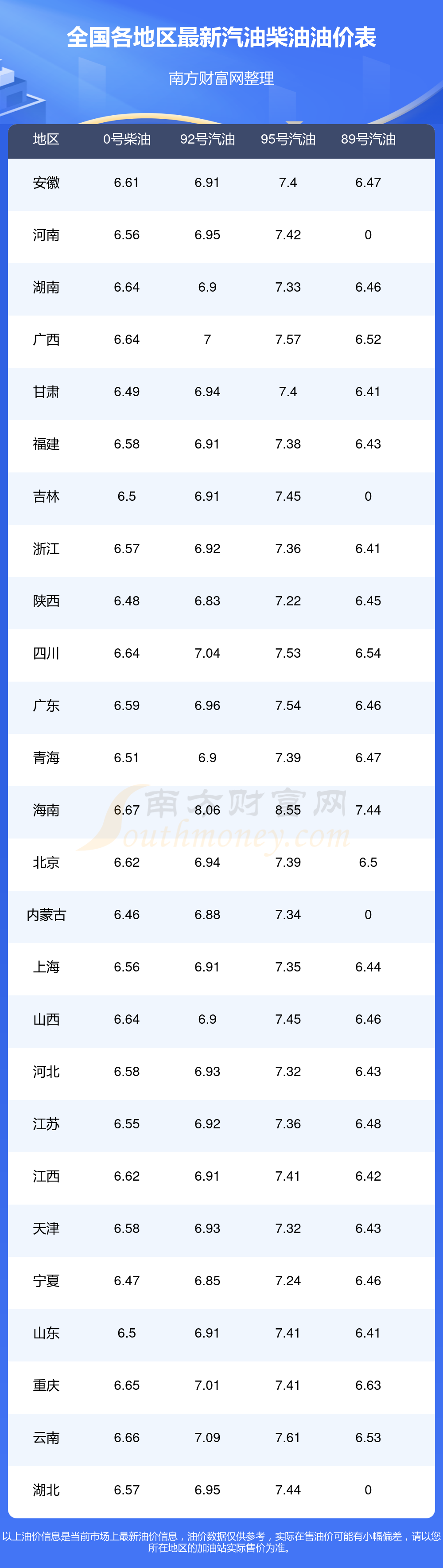 油價(jià)數(shù)據(jù)僅供參考,請(qǐng)以您所在地區(qū)的加油站報(bào)價(jià)為準(zhǔn)。南方財(cái)富網(wǎng)發(fā)布此信息的目的在于傳播更多信息,對(duì)使用該油價(jià)信息所導(dǎo)致的結(jié)果概不承擔(dān)任何責(zé)任。