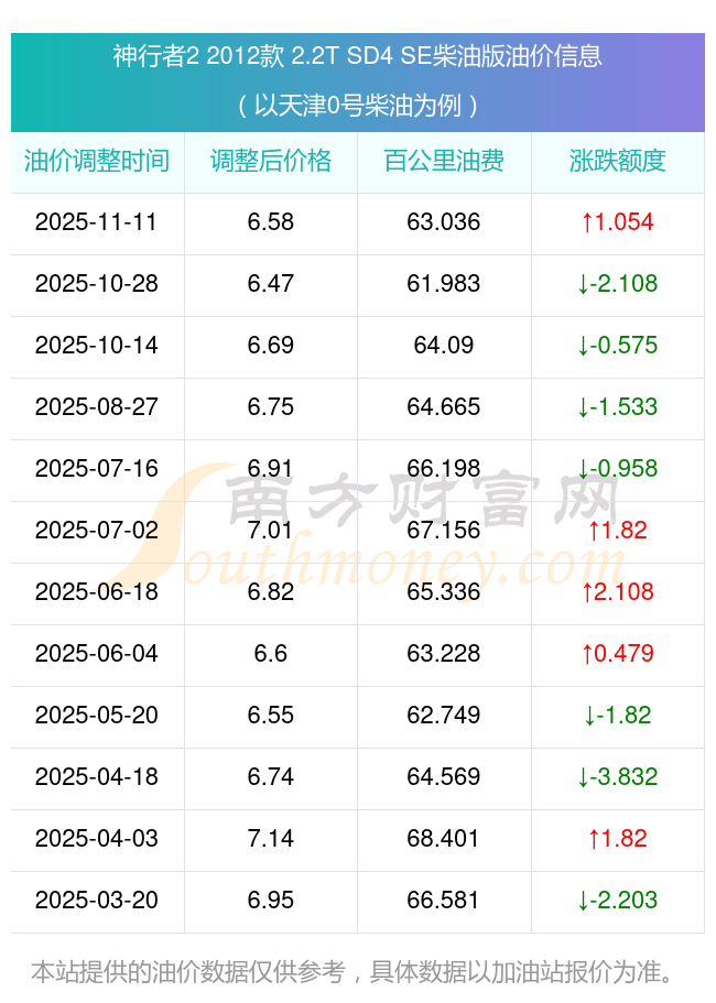 依照11月11日0號(hào)柴油最新調(diào)整價(jià)格6.58元/升來(lái)計(jì)算(以天津?yàn)槔?,該車型百公里的平均油費(fèi)是63.036元,依照上一輪10月28日調(diào)整價(jià)格6.47元/升來(lái)計(jì)算,百公里的平均油費(fèi)是61.983元,對(duì)比上一輪多花1.054元,下一輪的油價(jià)調(diào)整時(shí)間11月24日24時(shí)。