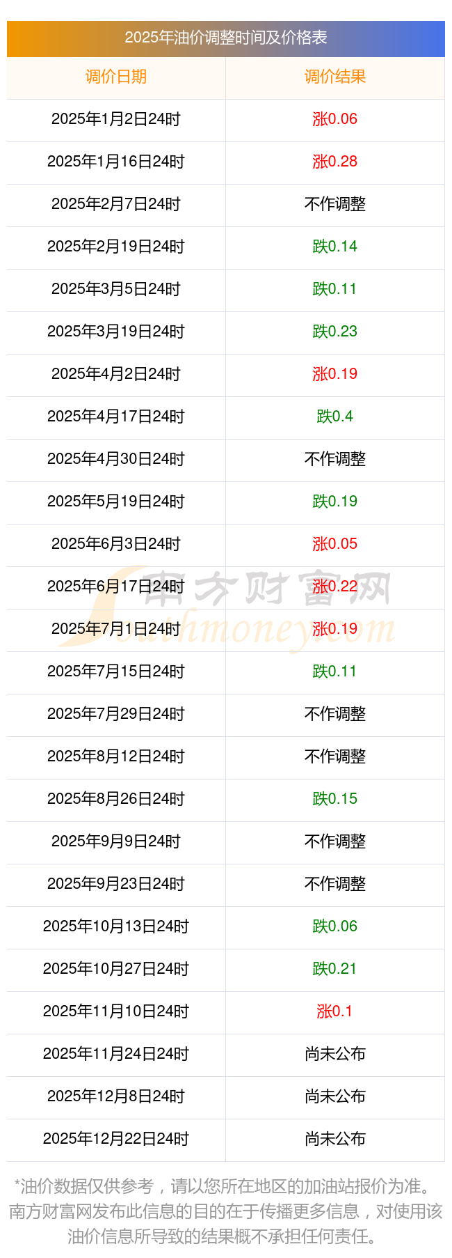 油價調(diào)整最新消息:下一輪油價調(diào)整時間11月24日24時。11月14日廣東汽油、柴油的最新價格是11月11日調(diào)整后的價格,具體為92號汽油6.96元,上升了0.1元,上升幅達1.46%;95號汽油7.54元,上升了0.11元,上升幅達1.48%;89號汽油6.46元,上升了0.09元,上升幅達1.41%;0號柴油6.59元,上升了0.1元,上升幅達1.54%。