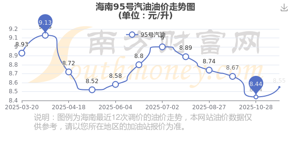 11月14日海南95號汽油最新油價是8.55元/升,本輪調(diào)整時間為11月11日,相對上一輪調(diào)整時間10月28日的油價8.44元/升,上漲了0.11元。