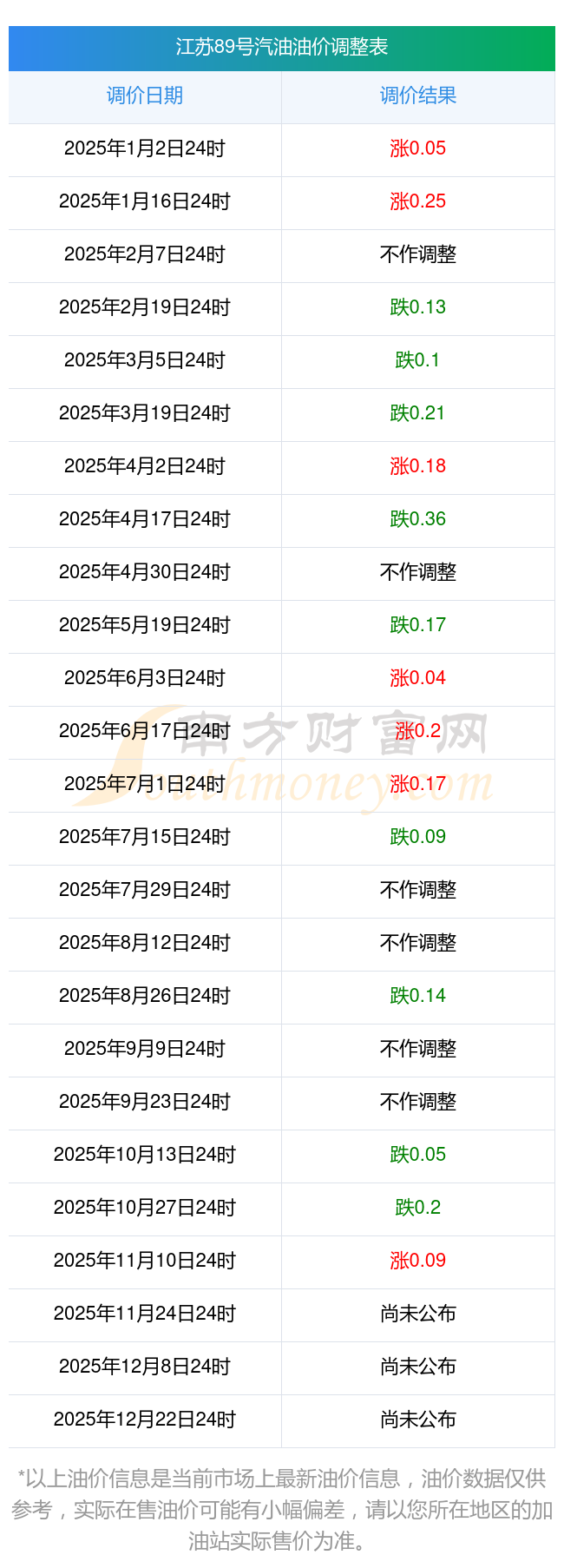 2025年油價調(diào)整一覽表