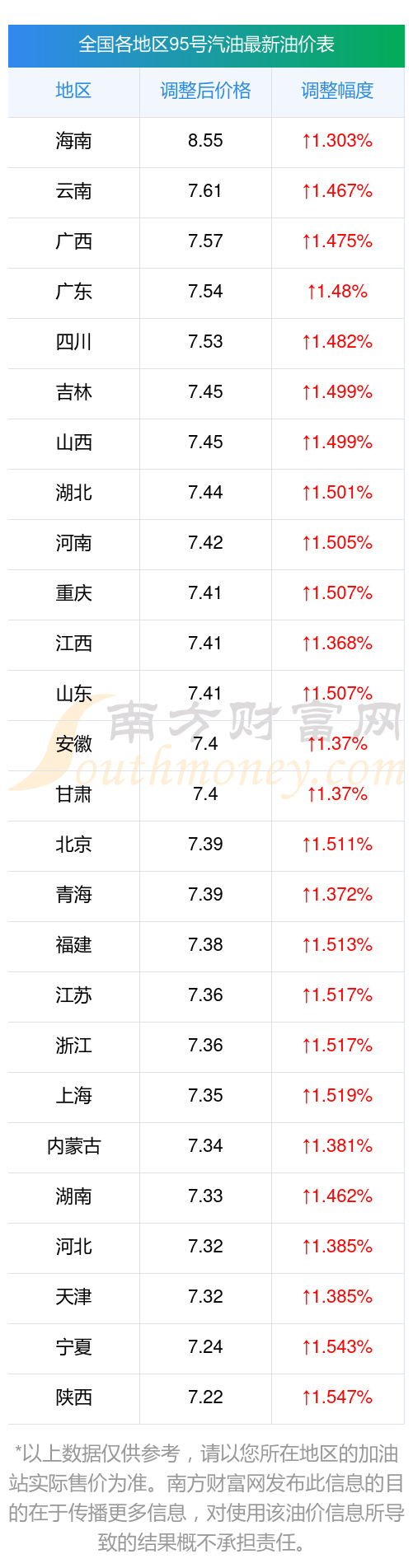 全國95號汽油平均價格為:7元每升,其中,最低為陜西,價格7.22元/升,最高為海南,價格8.55元/升。