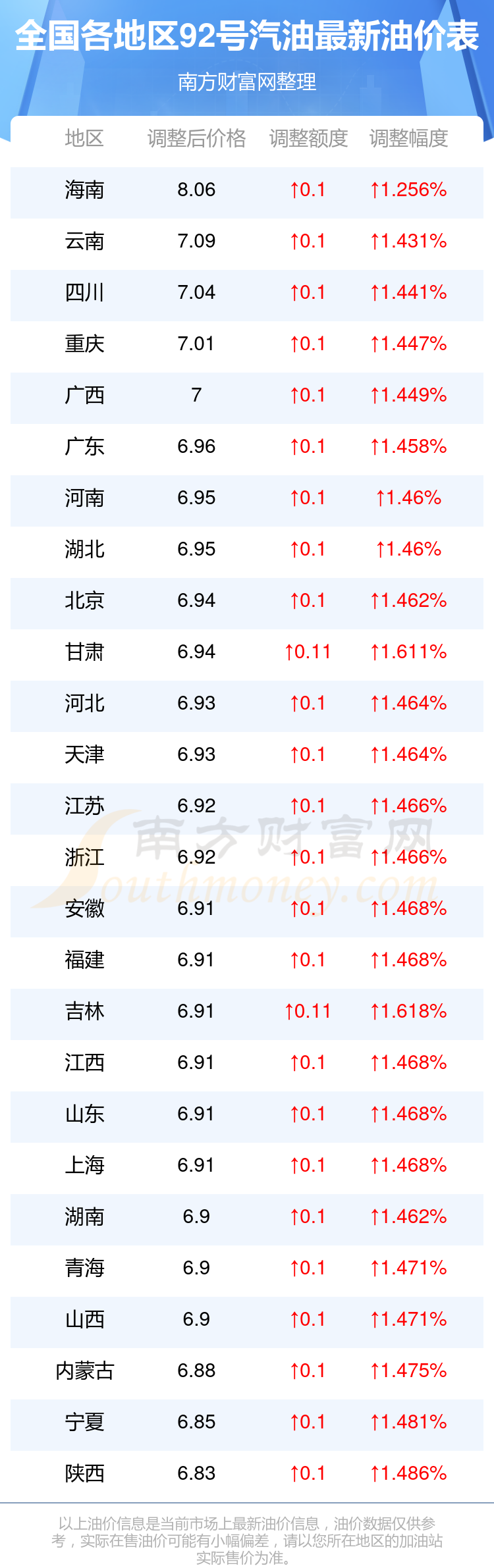 全國(guó)各地區(qū)92號(hào)汽油油價(jià)一覽表