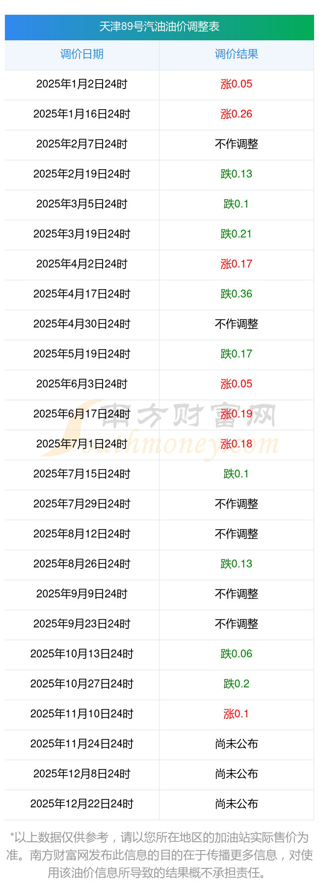 2025年天津汽油價(jià)格調(diào)整一覽表
