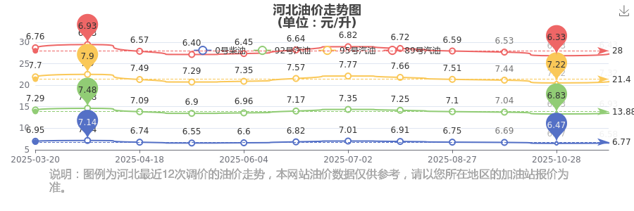 11月14日,河北汽油、柴油價(jià)格的調(diào)整時(shí)間為11月11日。每升最新價(jià)格為:92號(hào)汽油為6.93元,增了0.1元;95號(hào)汽油為7.32元,增了0.1元;89號(hào)汽油為6.43元,增了0.1;0號(hào)柴油為6.58元,增了0.11元。