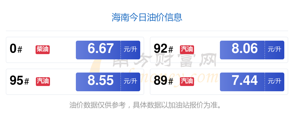 11月14日海南海口汽油、柴油每升的價格是11月11日調整后的價格:92號汽油為8.06元,上漲了0.1元,上漲幅達1.26%;95號汽油為8.55元,上漲了0.11元,上漲幅達1.3%;89號汽油為7.44元,上漲了0.09元,上漲幅達1.22%;0號柴油為6.67元,上漲了0.11元,上漲幅達1.68%。海南?下一輪油價調整時間11月24日24時,距離現(xiàn)在還有10.57天。