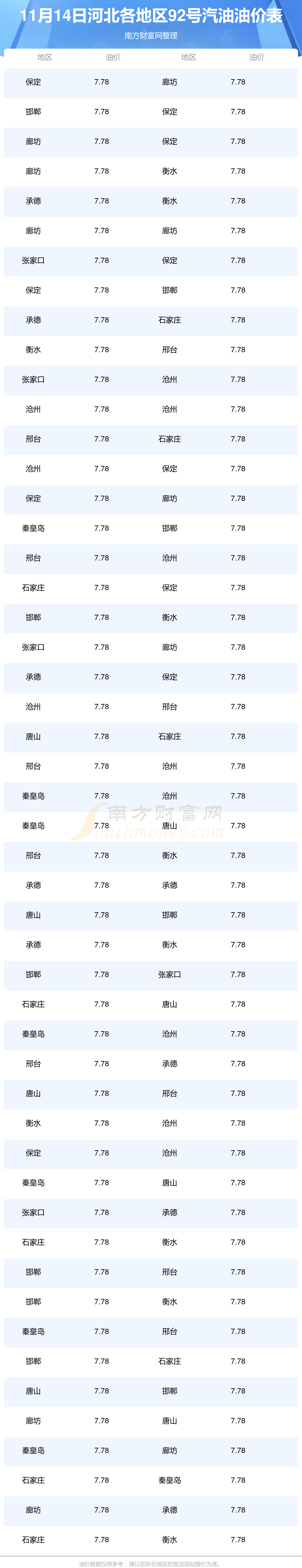 2025年11月14日河北92號(hào)汽油最新價(jià)格一覽表