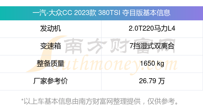 一汽-大眾CC 2023款 380TSI 奪目版動(dòng)力上搭載的是一臺(tái)2.0T220馬力L4渦輪增壓發(fā)動(dòng)機(jī),匹配7擋濕式雙離合自動(dòng)檔變速箱,燃料形式為汽油,常規(guī)整備質(zhì)量1650kg,廠家參考價(jià)26.79萬(wàn)元。