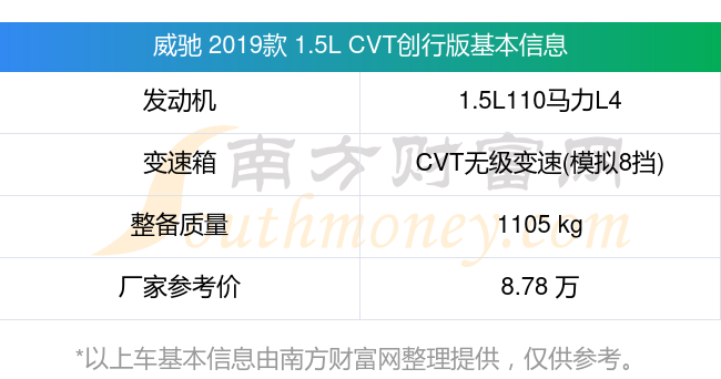 在動力上,威馳 2019款 1.5L CVT創(chuàng)行版配備的是一臺1.5L110馬力L4自然吸氣發(fā)動機(jī),匹配的是CVT無級變速(模擬8擋)自動檔變速箱,燃料形式為汽油,常規(guī)整備質(zhì)量1105kg,廠家參考價8.78萬元。