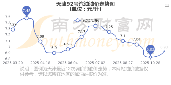 11月15日,天津92號(hào)汽油的價(jià)格是6.93元每升,本次的調(diào)整時(shí)間為11月11日,對(duì)比上次的調(diào)整升了0.1元,升1.464%,11月24日24時(shí)為下一輪油價(jià)調(diào)整時(shí)間,還有9.9天。