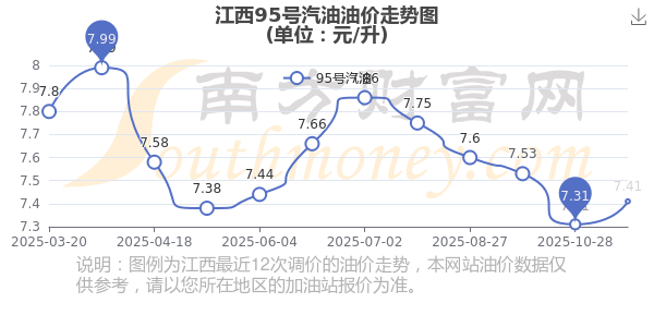 11月15日,江西95號(hào)汽油的價(jià)格是7.41元每升,本次的調(diào)整時(shí)間為11月11日,對(duì)比上次的調(diào)整上漲了0.1元,上漲1.368%,11月24日24時(shí)為下一輪油價(jià)調(diào)整時(shí)間,還有9.88天。