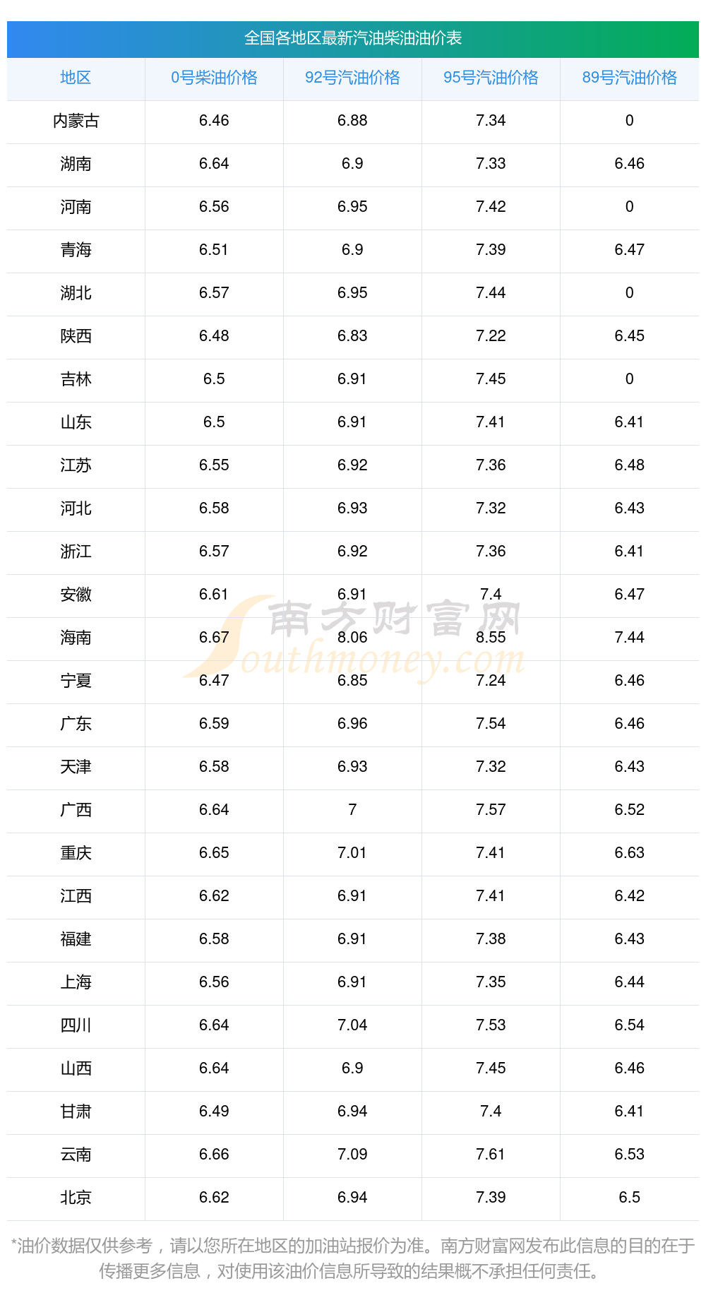 0號(hào)柴油平均價(jià)格:7元每升,其中,最高為海南,價(jià)格為6.67元/升,最低為內(nèi)蒙古,價(jià)格為6.46元/升。