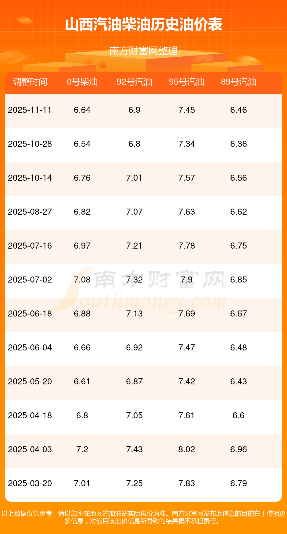 11月15日山西汽油、柴油的價格為11月11日調(diào)整后的價格。每升最新價格為:92號汽油6.9元,漲了0.1元;95號汽油7.45元,漲了0.11元;89號汽油6.46元,漲了0.1;0號柴油6.64元,漲了0.1元。