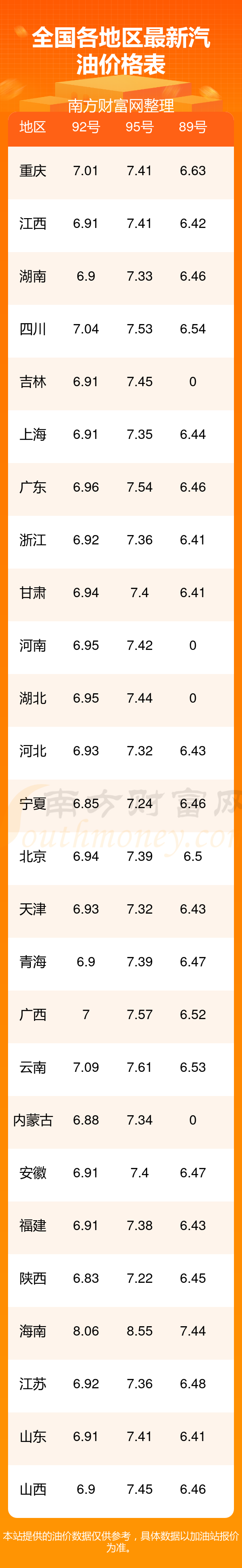 全國各地區(qū)2025年最新油價表