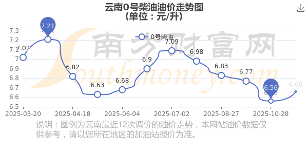11月15日,云南0號柴油的價格是6.66元每升,本次的調整時間為11月11日,對比上次的調整上升了0.1元,上升1.524%,11月24日24時為下一輪油價調整時間,還有9.82天。