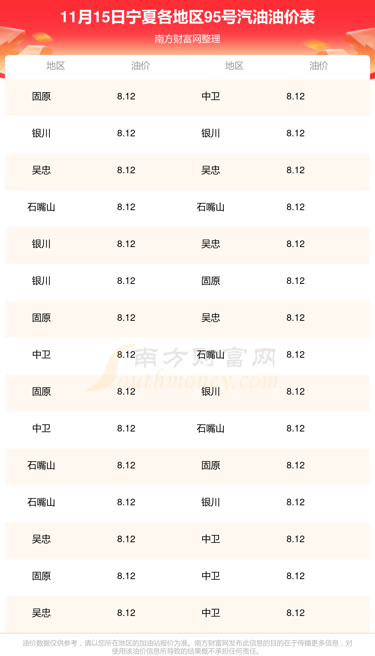 寧夏95號汽油11月15日價格為7.24元/升,調(diào)整時間為11月11日,相對上次調(diào)整漲了0.11元,漲1.543%。