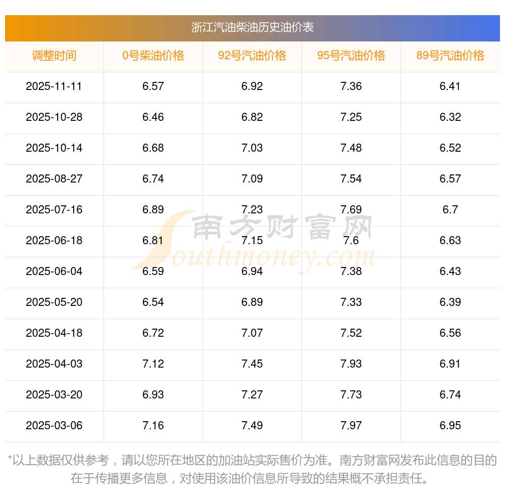 11月15日,浙江92號汽油的這些價(jià)格為6.92元每升,調(diào)整時(shí)間為11月11日,相對上次調(diào)整上漲了0.1元,上漲1.466%。