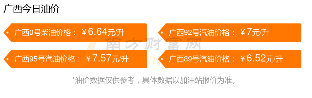 11月15日廣西汽油、柴油每升的最新價格:92號汽油7元;95號汽油7.57元;89號汽油6.52元,漲了0.09;0號柴油6.64元,本輪油價的調(diào)整時間是11月11日。
