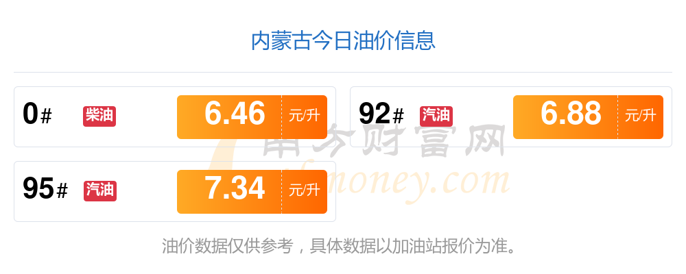 以上數(shù)據(jù)僅供參考,請以您所在地區(qū)的加油站實(shí)際售價(jià)為準(zhǔn)。南方財(cái)富網(wǎng)發(fā)布此信息的目的在于傳播更多信息,對使用該油價(jià)信息所導(dǎo)致的結(jié)果概不承擔(dān)責(zé)任。
