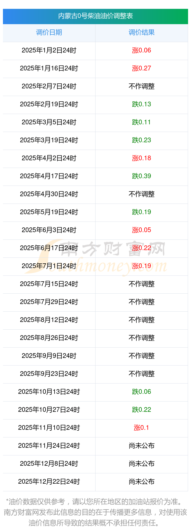 11月15日,內(nèi)蒙古0號柴油的價(jià)格是6.46元每升,本次的調(diào)整時(shí)間為11月11日,對比上次的調(diào)整增了0.1元,增1.572%,下次調(diào)整時(shí)間為11月24日24時(shí),還有9.74天。