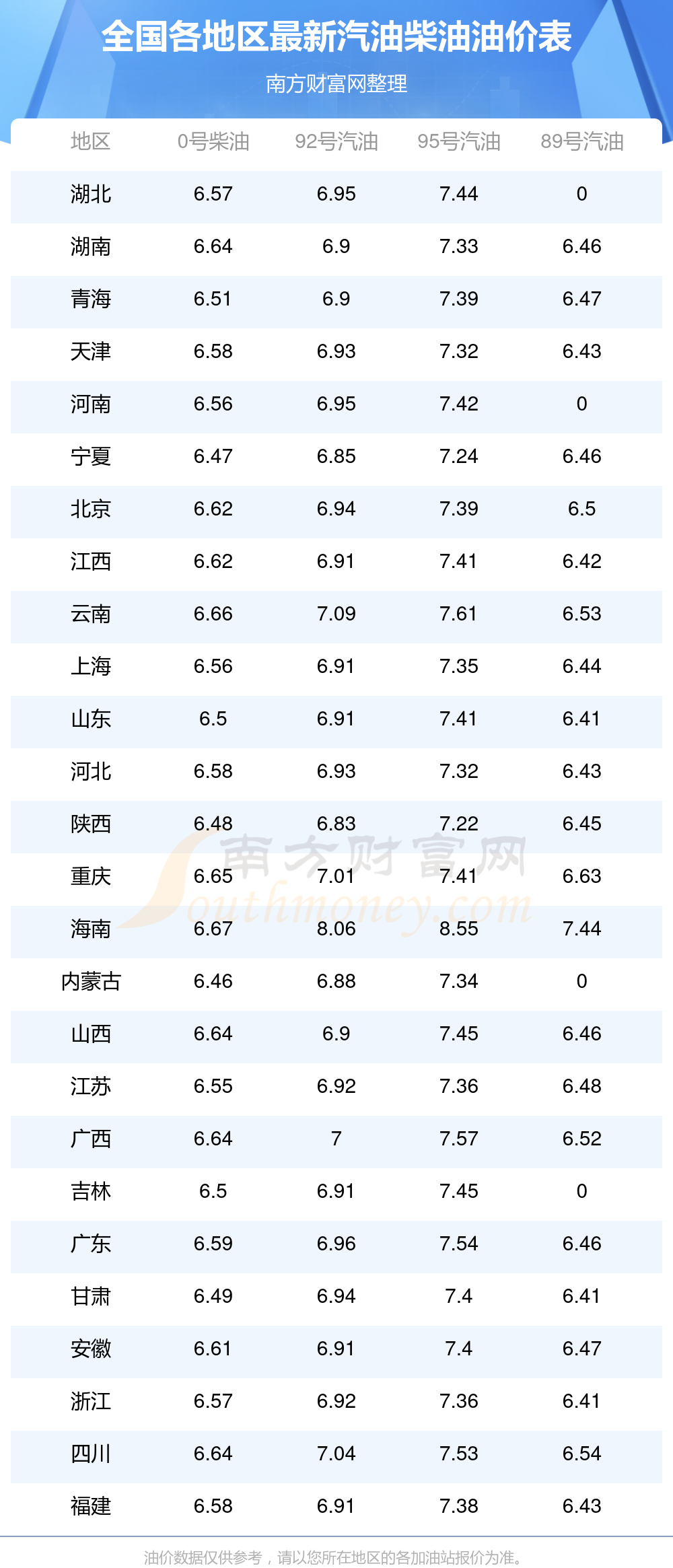 油價數(shù)據(jù)僅供參考,請以您所在地區(qū)的加油站報價為準。南方財富網(wǎng)發(fā)布此信息的目的在于傳播更多信息,對使用該油價信息所導致的結果概不承擔任何責任。