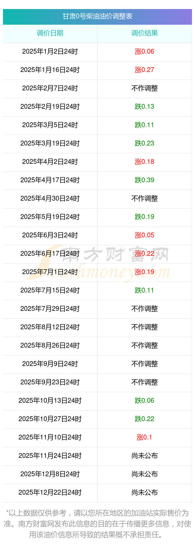 以上數(shù)據(jù)僅供參考,請以您所在地區(qū)的加油站實際售價為準。南方財富網(wǎng)發(fā)布此信息的目的在于傳播更多信息,對使用該油價信息所導致的結果概不承擔責任。