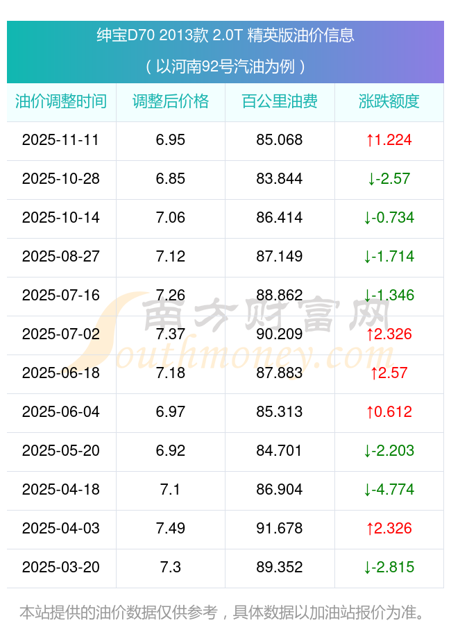 按照11月11日92號(hào)汽油最新調(diào)整價(jià)格6.95元/升來計(jì)算(以河南為例),該車型百公里平均油費(fèi)為85.068元,按照上一輪10月28日調(diào)整價(jià)格6.85元/升來計(jì)算,百公里平均油費(fèi)為83.844元,對(duì)比上一輪多花1.224元,下一輪油價(jià)調(diào)整時(shí)間為11月24日24時(shí)。
