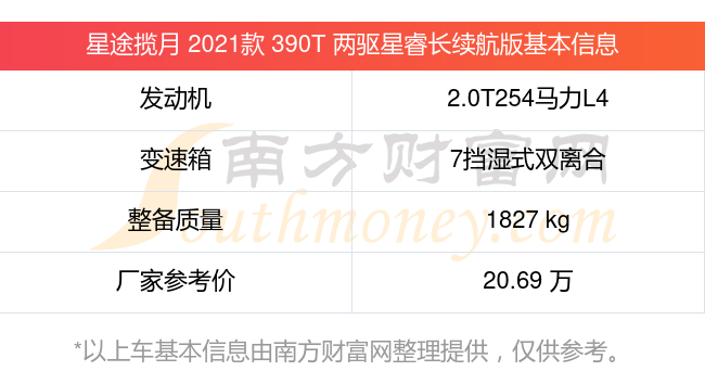 在動力方面,星途攬月 2021款 390T 兩驅星睿長續(xù)航版搭載的是一臺2.0T254馬力L4渦輪增壓發(fā)動機,匹配7擋濕式雙離合自動檔變速箱,燃料形式為汽油,常規(guī)整備質量1827kg,廠家參考價20.69萬元。